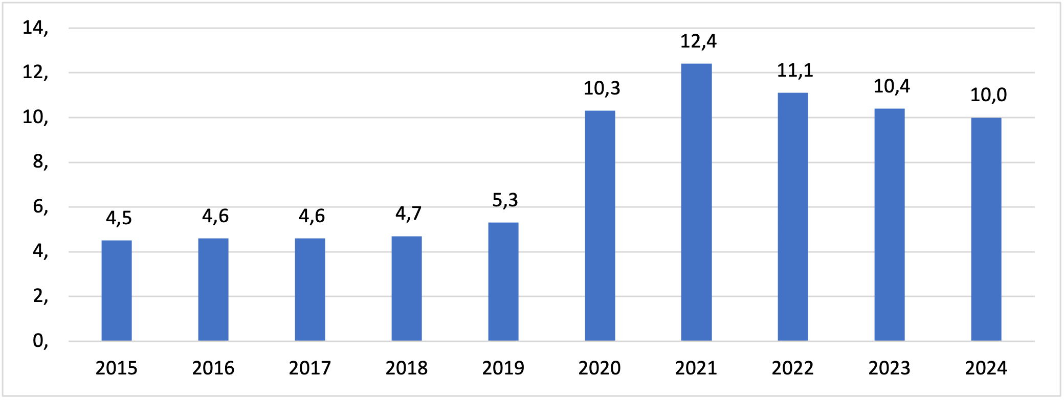 The EU average for employed adults working from home has fluctuated: from 4.5% in 2015 and peaks in 2020-2022 (due to COVID-19 limitations) of 10.3%, 12.4%, and 11.11%, to a stable level of 10% in 2025.